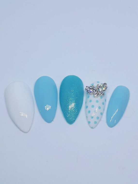 Baby Blue Butterfly Nails Press On Nails Fake Nails Rhinestone Polkadot Polka Dot Glitter Sparkle 3d Girly Pretty White Pastel